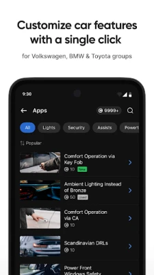 - One-Click Apps: Customize your Audi, Volkswagen, Škoda, Seat, or Cupra features with a single click. Our pre-made coding options – One-Click Apps – let you activate, turn off, and adjust car’s comfort and safety functions fast and easily.