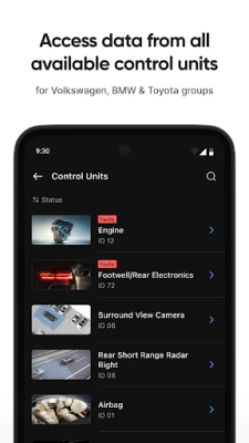 - Advanced Diagnostics: Scan all control units, diagnose, clear, and share fault codes. View battery status.
